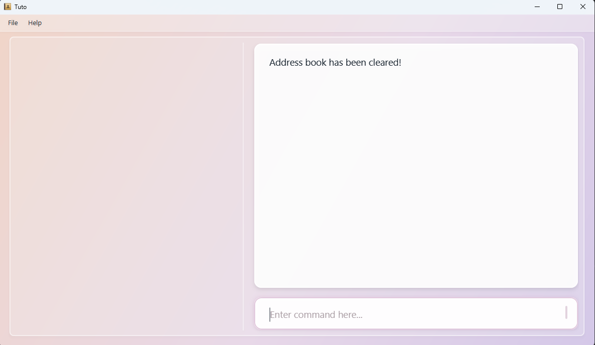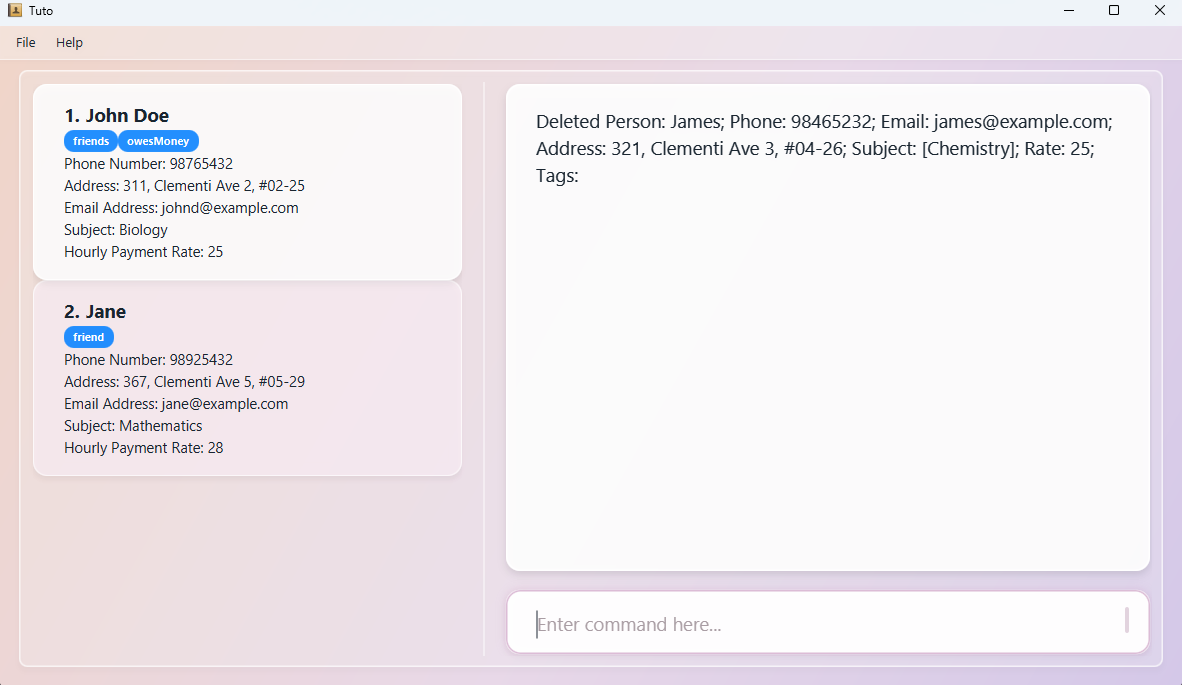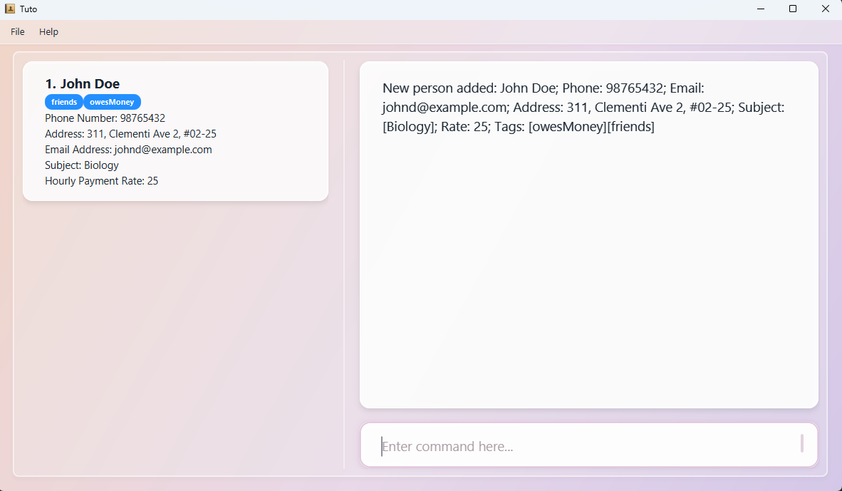 Tuto is a desktop app that helps parents manage a list of freelance tutors for their children. It is optimised for users who prefer typing commands over clicking through menus, while still providing a clean visual interface to view tutor information at a glance.