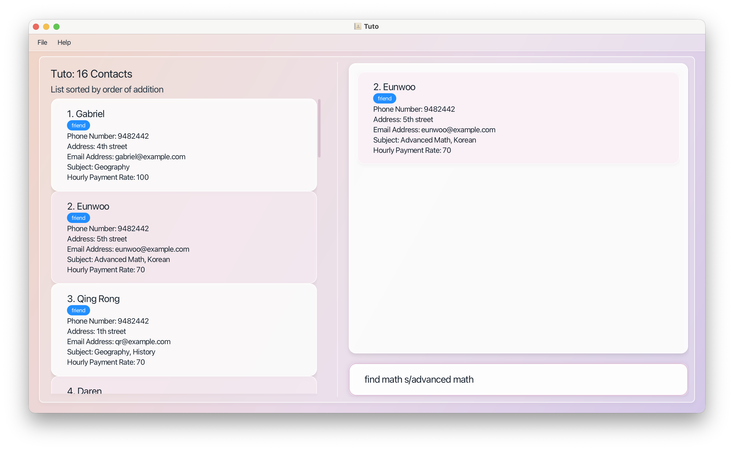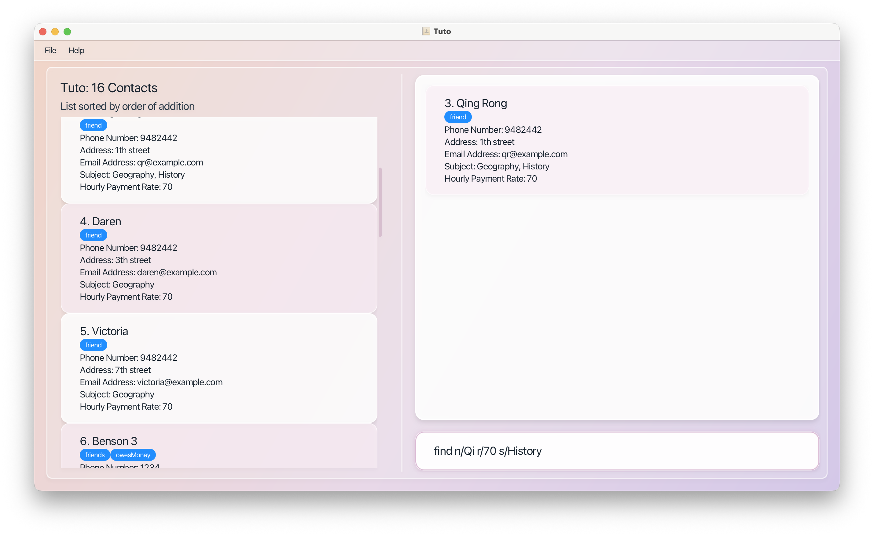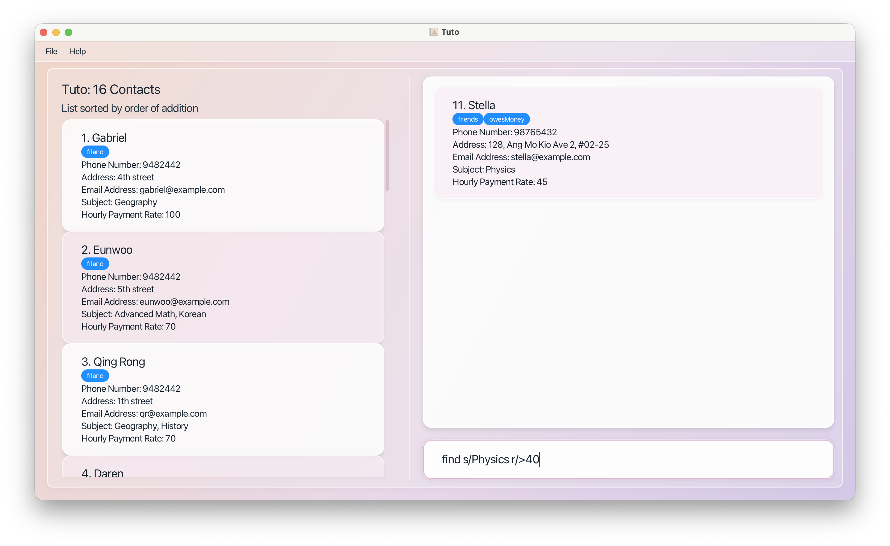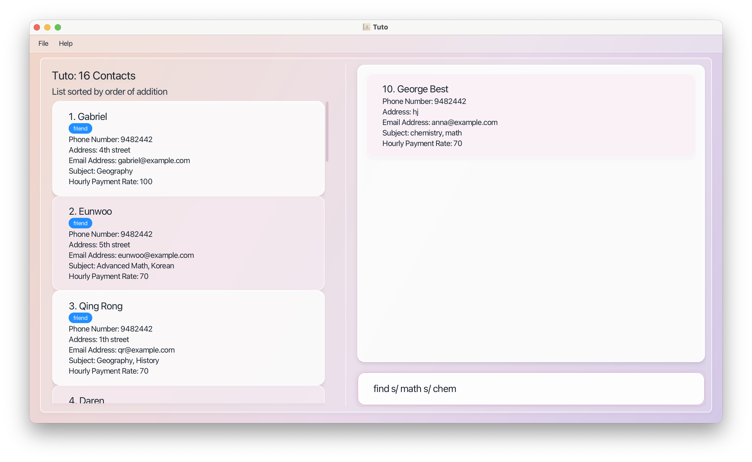 | Filtering | find [PREFIXES] (case-insensitive) | Tutors matching all prefix conditions |