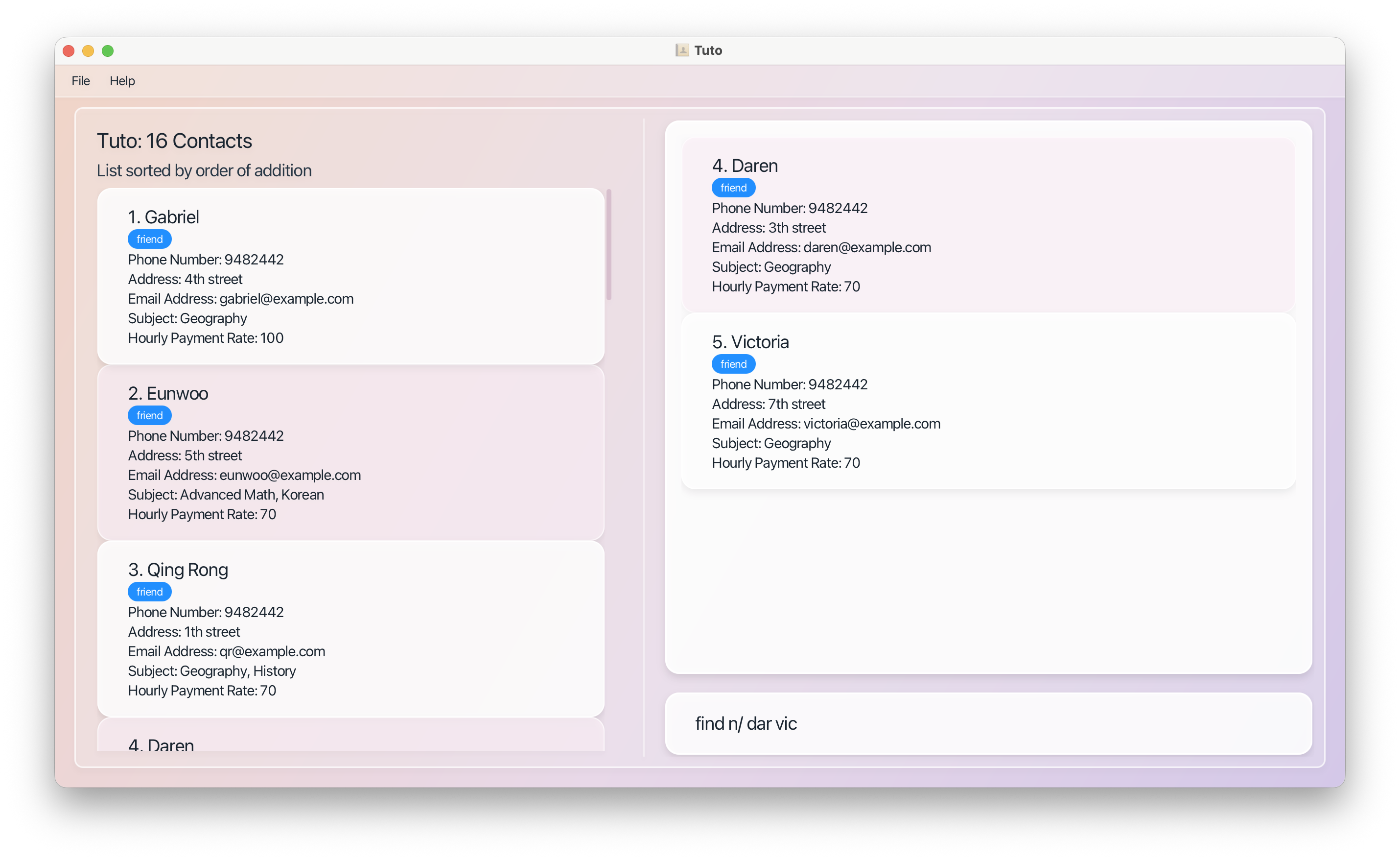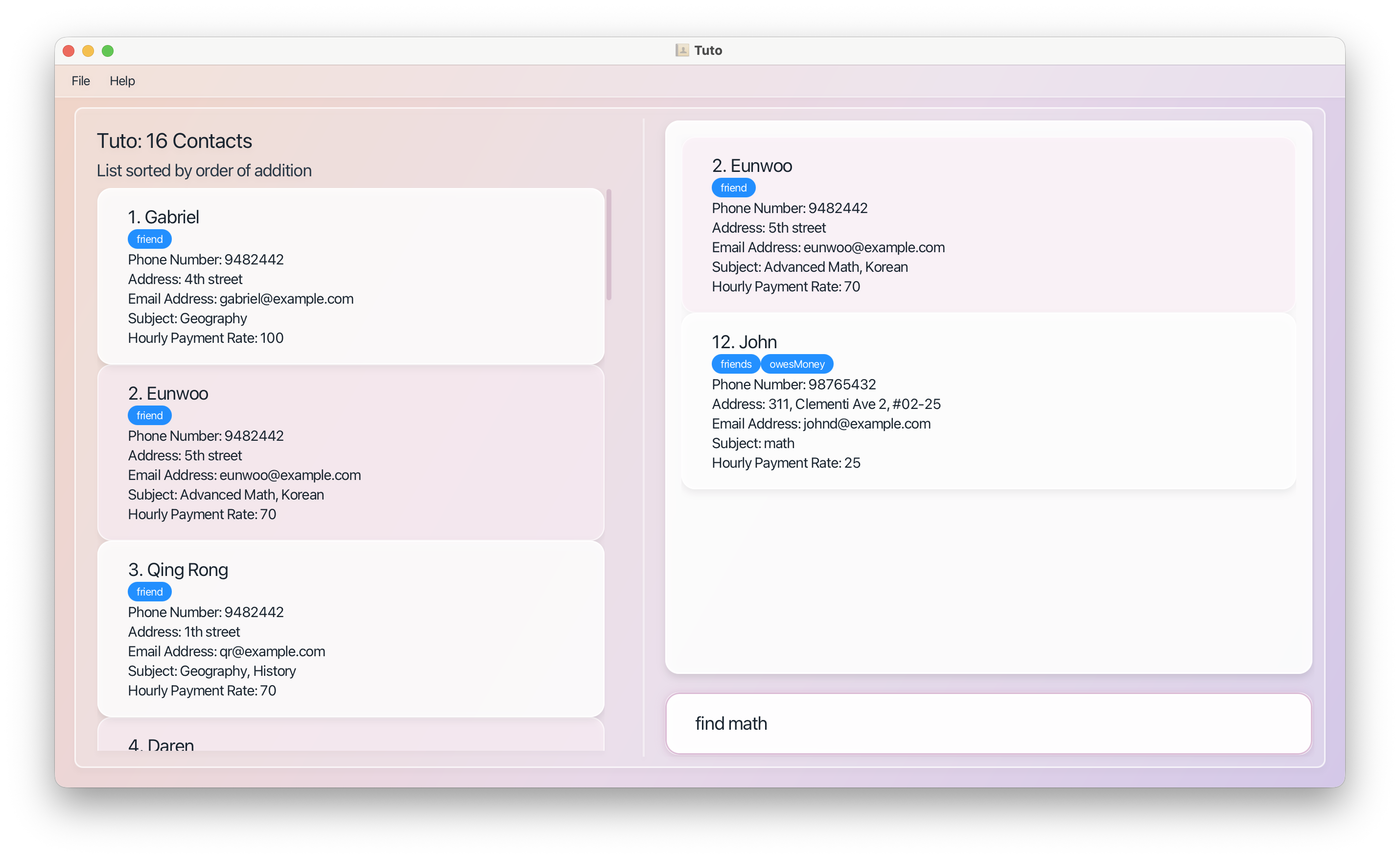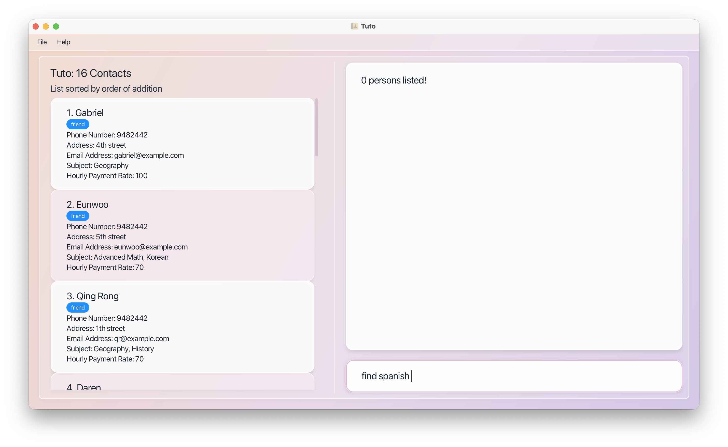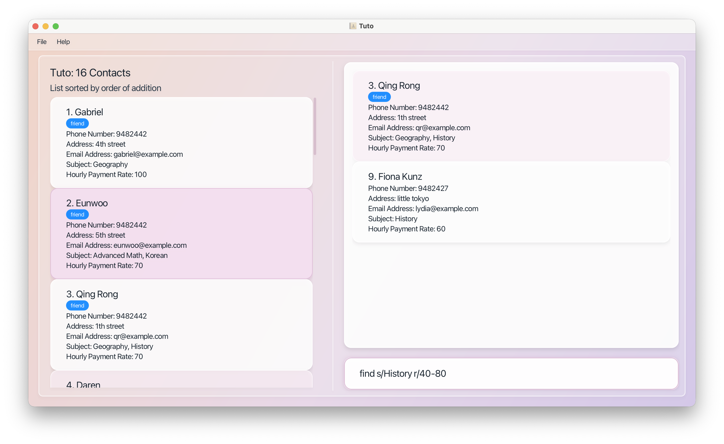 | Filtering | find [PREFIXES] (case-insensitive) | Tutors matching all prefix conditions |