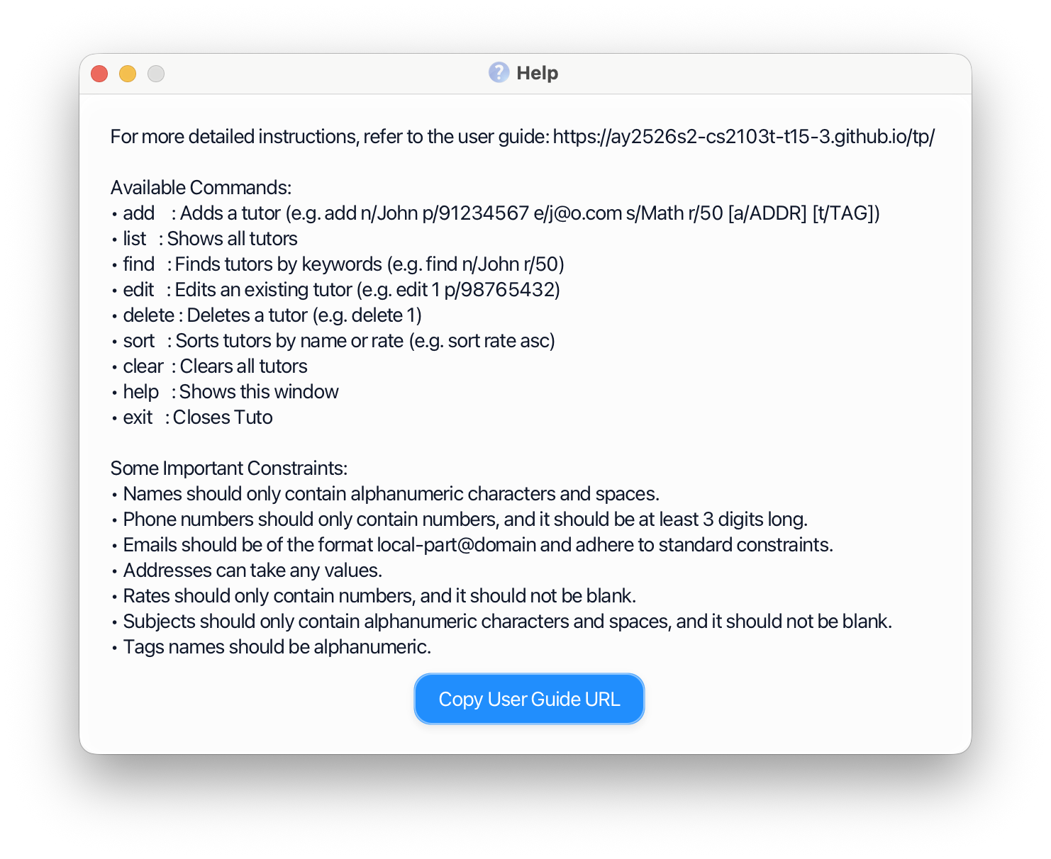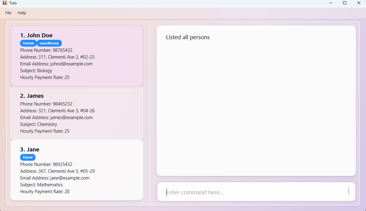 | Add | add n/NAME p/PHONE_NUMBER e/EMAIL s/SUBJECT1 s/SUBJECT2 ... s/SUBJECTn r/RATE [a/ADDRESS] [t/TAG]… | add n/James Ho p/22224444 e/jamesho@example.com a/123, Clementi Rd, 1234665 s/Biology r/45 t/friend t/colleague |